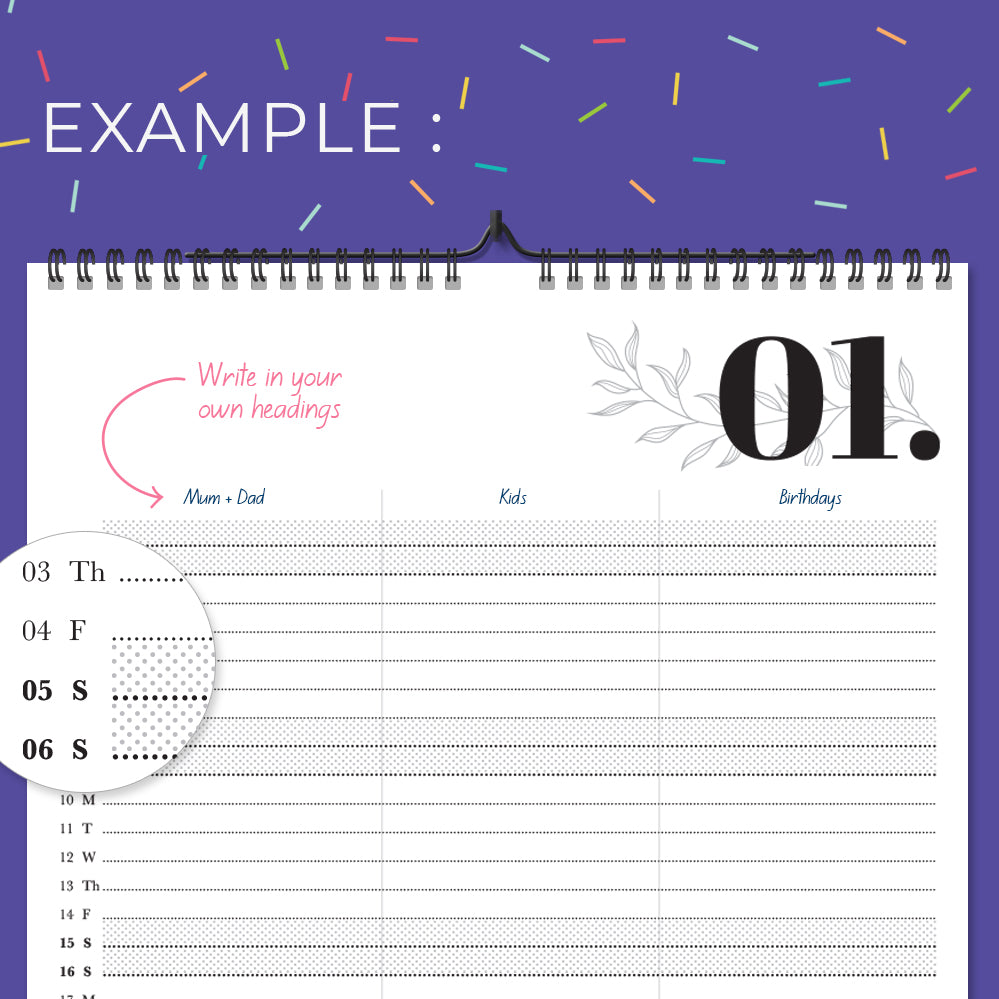 Assign each family member a column to easily coordinate schedules, appointments, birthdays, and holidays at a glance.