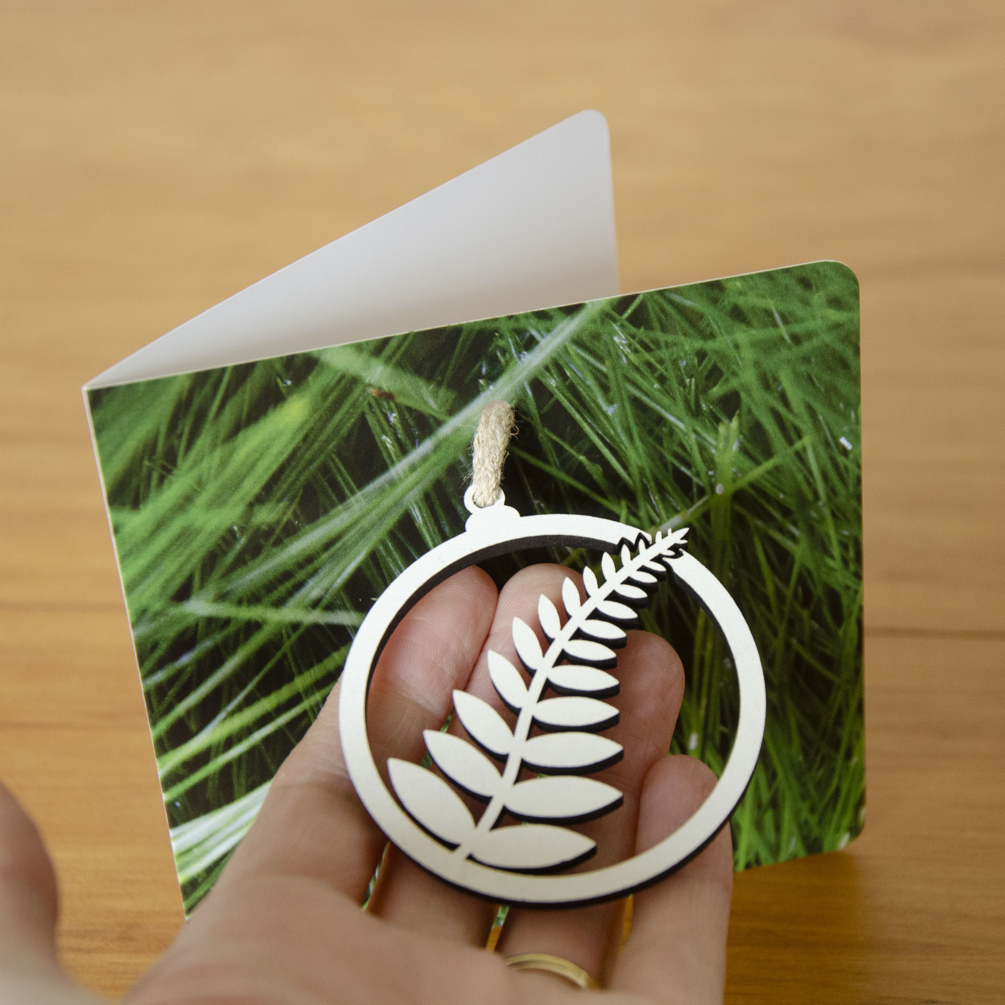 A beautiful NZ Fern Christmas tree decoration hanging on a greeting card.