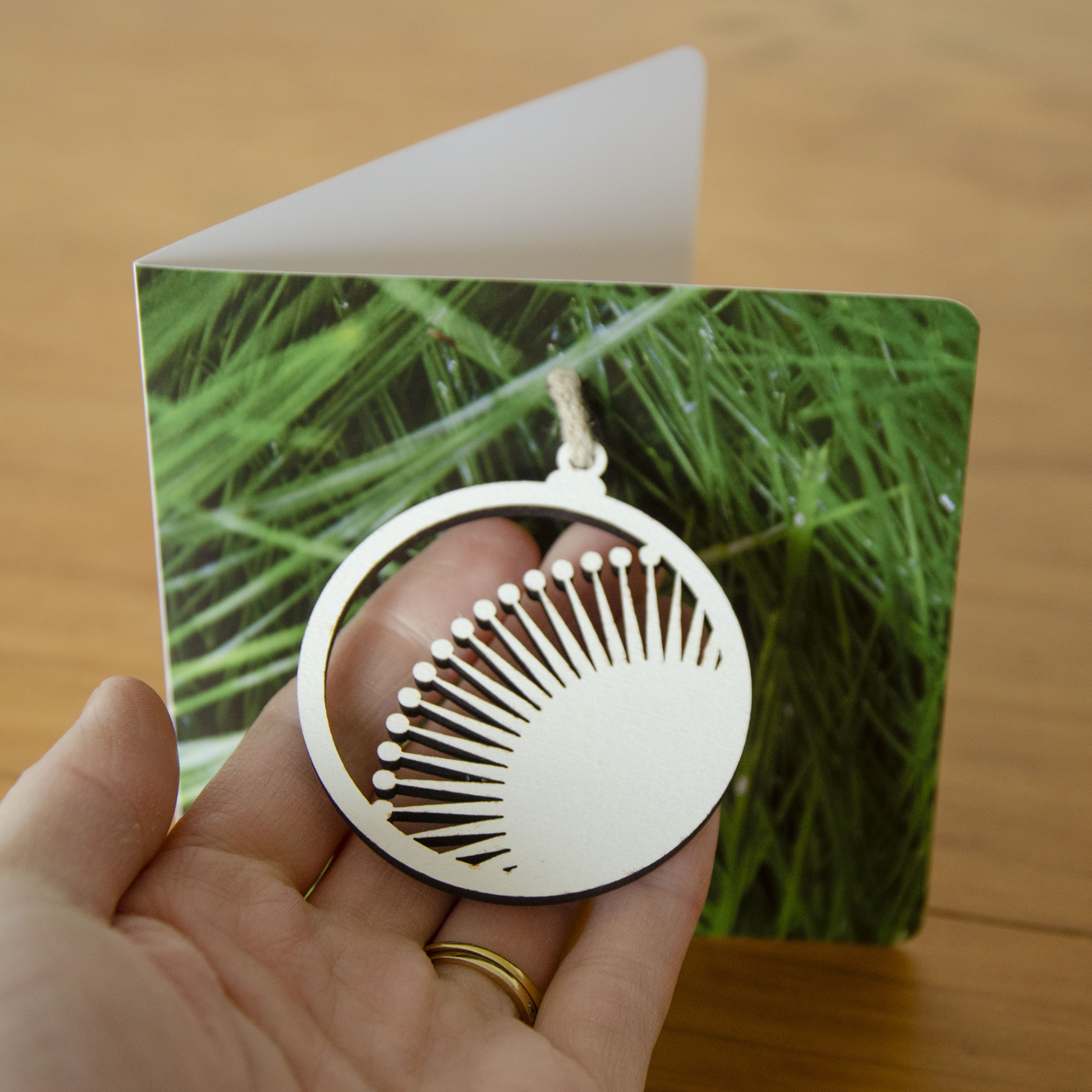 A beautiful Pohutakawa decoration hanging on a greeting card.